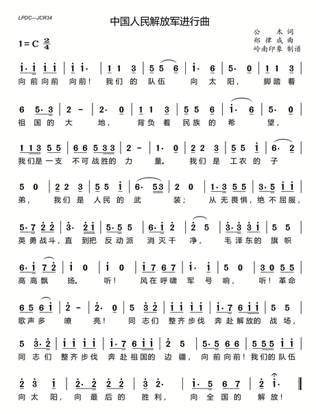 中國人民解放軍軍歌,歌名為《中國人民解放軍進行曲》,由公木作詞,鄭律成作曲,創(chuàng)作于1939年。
